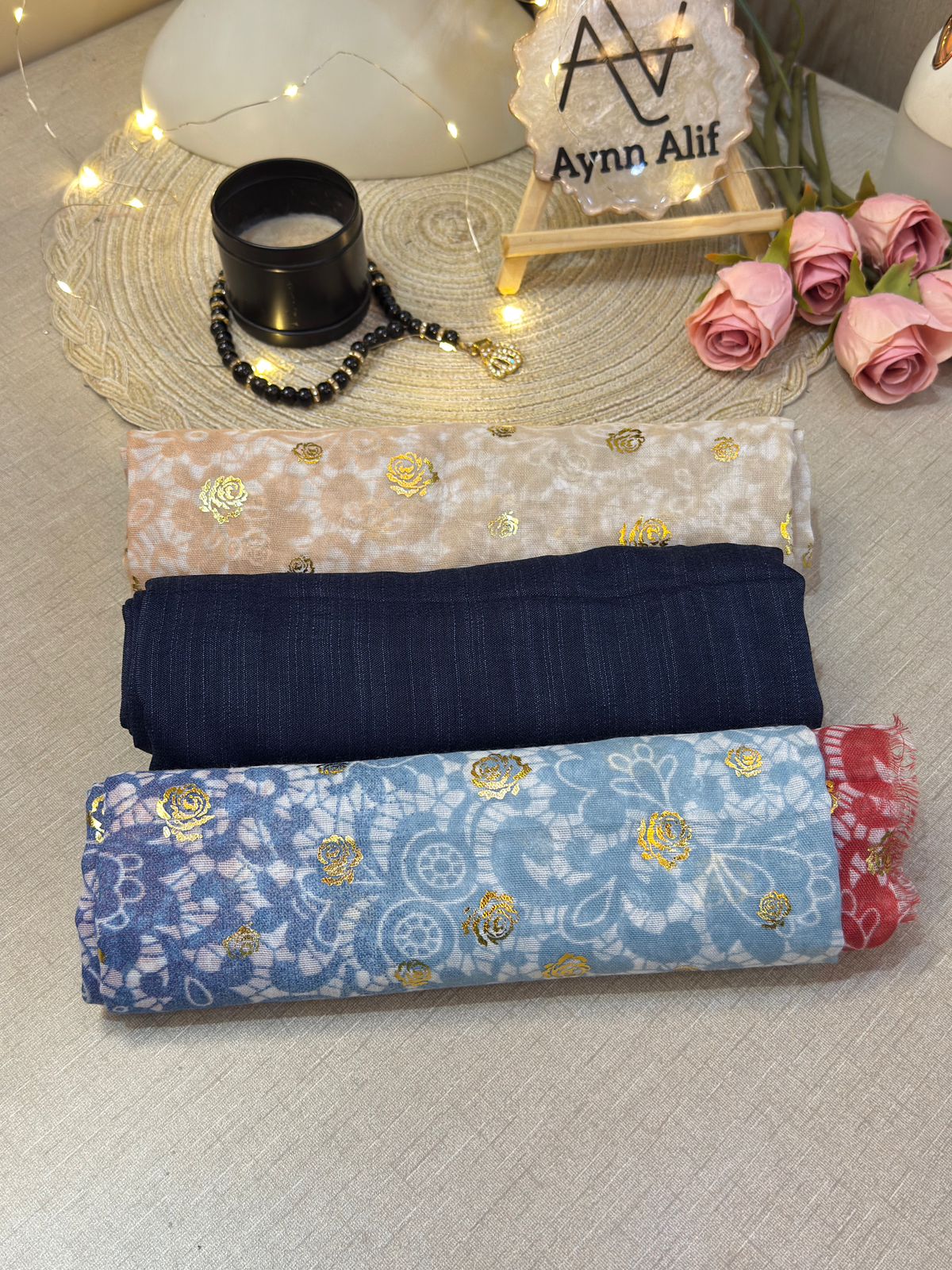 2 printed lawn hijabs and 1 navy blue solid lawn hijab