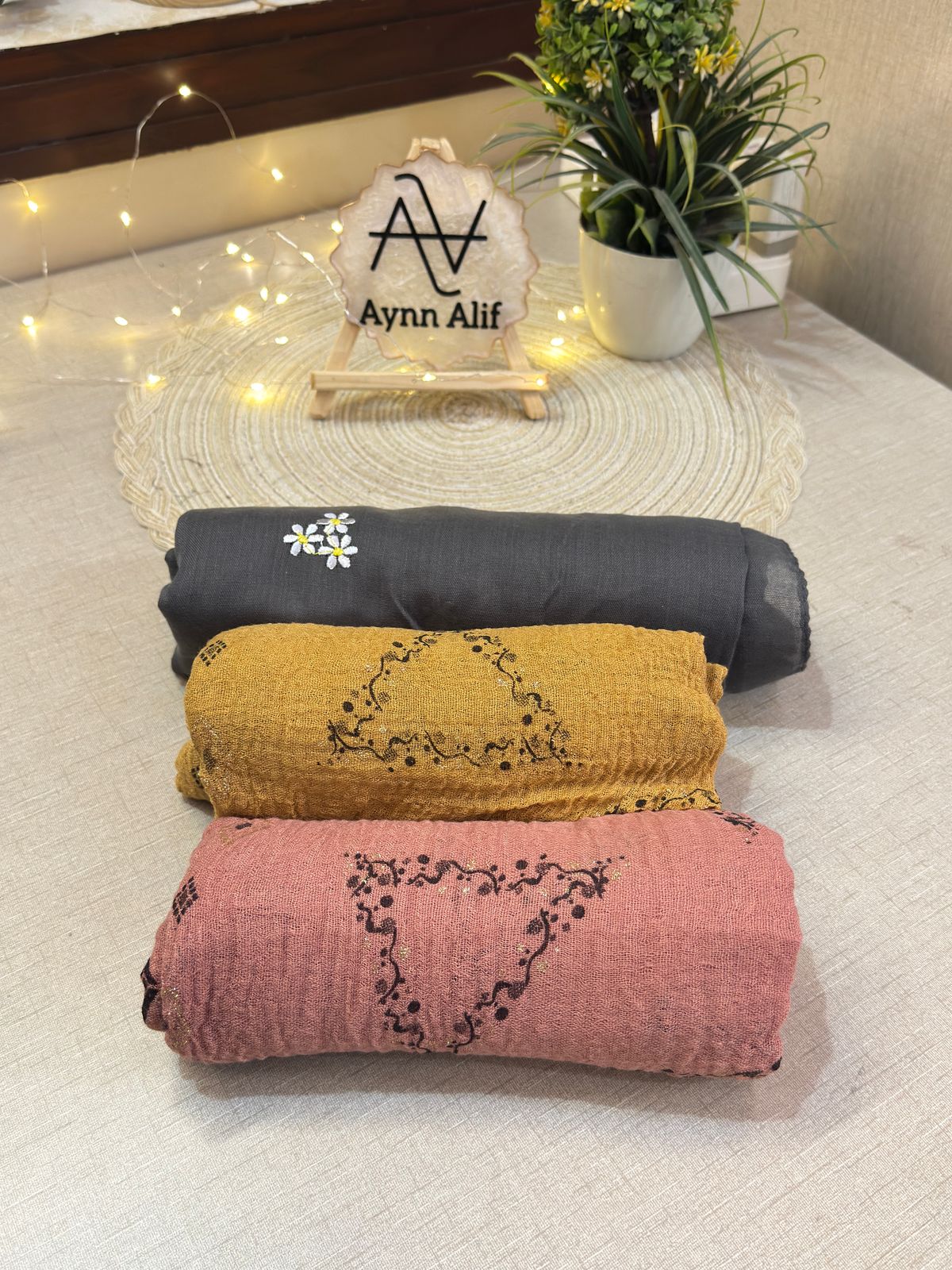 Dark grey floral embroidered lawn hijab, block print crimp lawn hijabs in mustard and chestnut