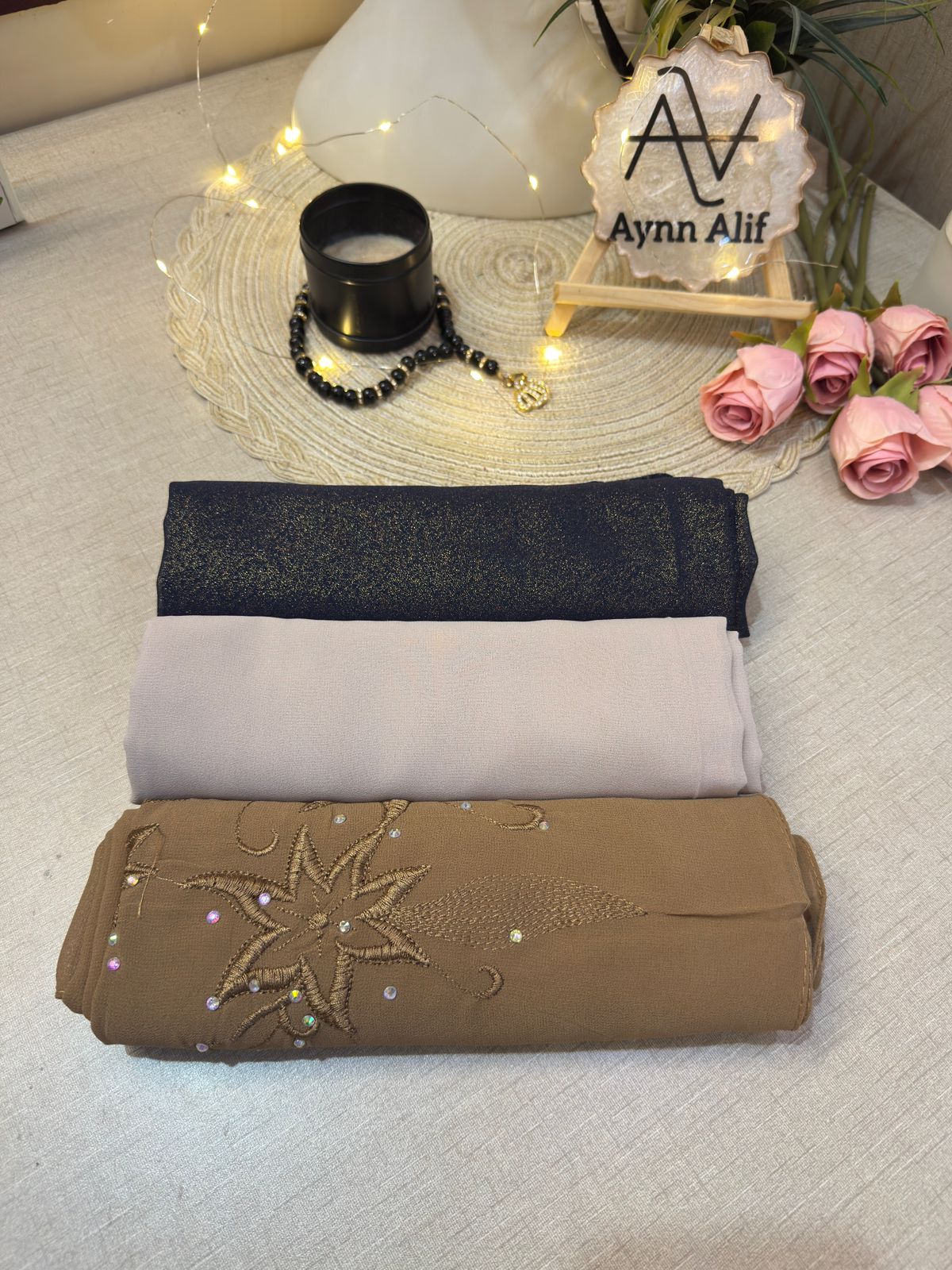 1 Moonlight Chiffon Georgette Hijab, 1 Plain Chiffon Georgette Hijab and 1 Floral Embroidered Chiffon Georgette Hijab