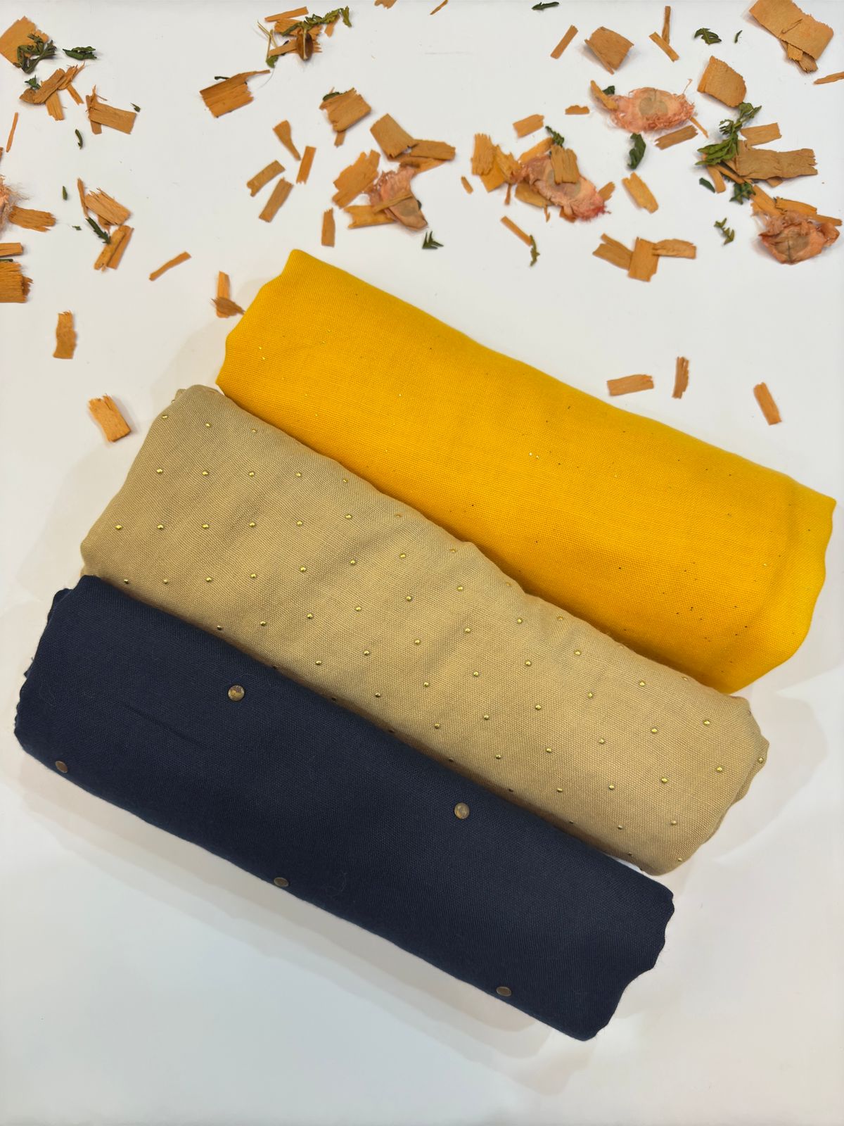 Yellow Lawn Glitter, Beige Lawn Golden Dotted and Navy-Blue Lawn Metal Studded