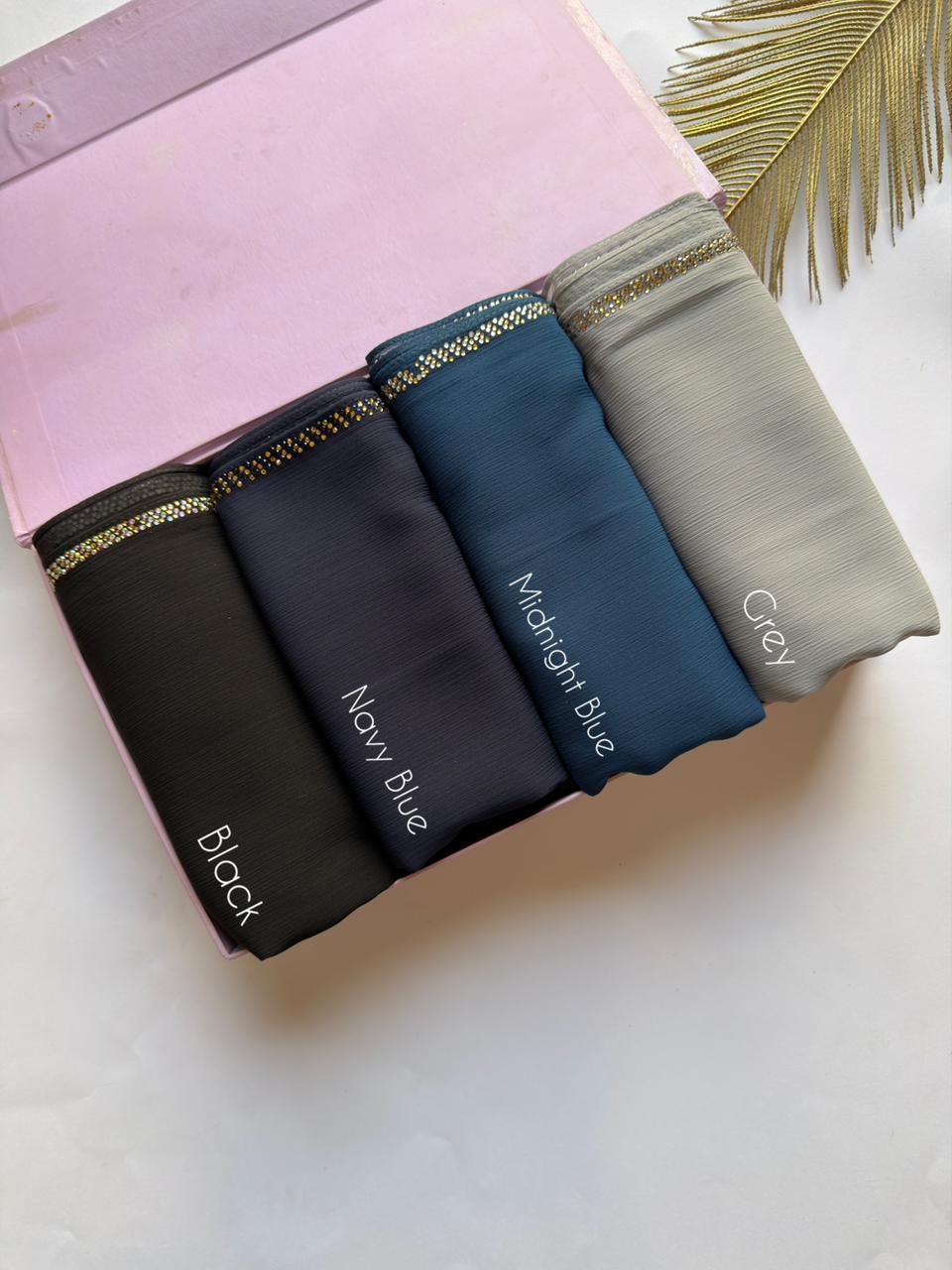 Our luxurious crinkle chiffon hijabs with subtle rhinestone detailing are made for those who love understated glam. Best paired with an undercap. Available in 12 graceful shades