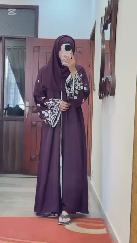 Embrace elegance with this stunning violet abaya! The front open design adds a touch of modernity, while the white piping and intricate embroidery on the sleeves elevate its charm. Crafted from luxurious nidah fabric, it drapes beautifully and comes with a matching hijab for a complete look.