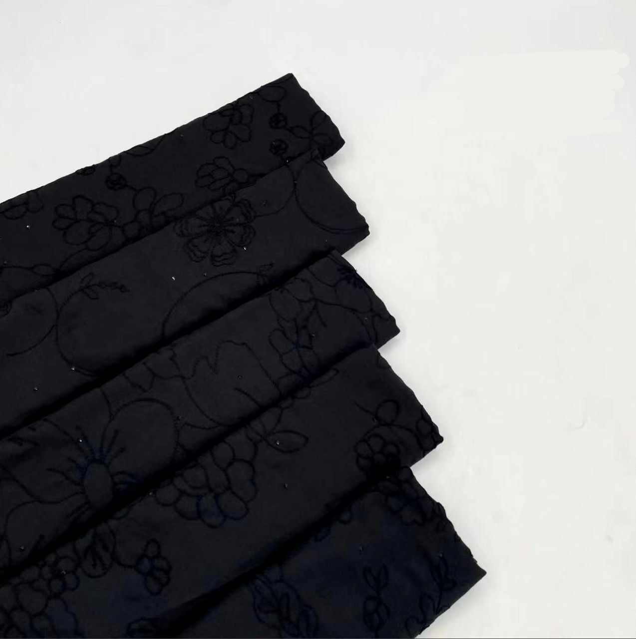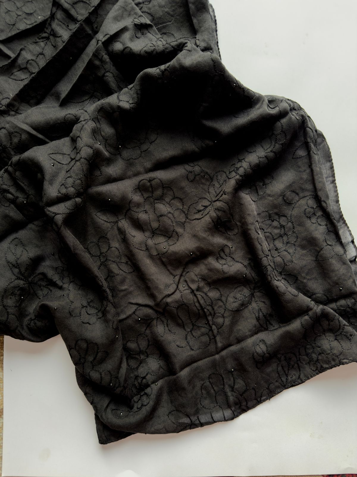 Elevate your look with this stunning black, lawn embroidered hijab! ✨ The intricate details and stone embellishments make it perfect for semi-formal or formal occasions. Drape yourself in elegance and make a statement!