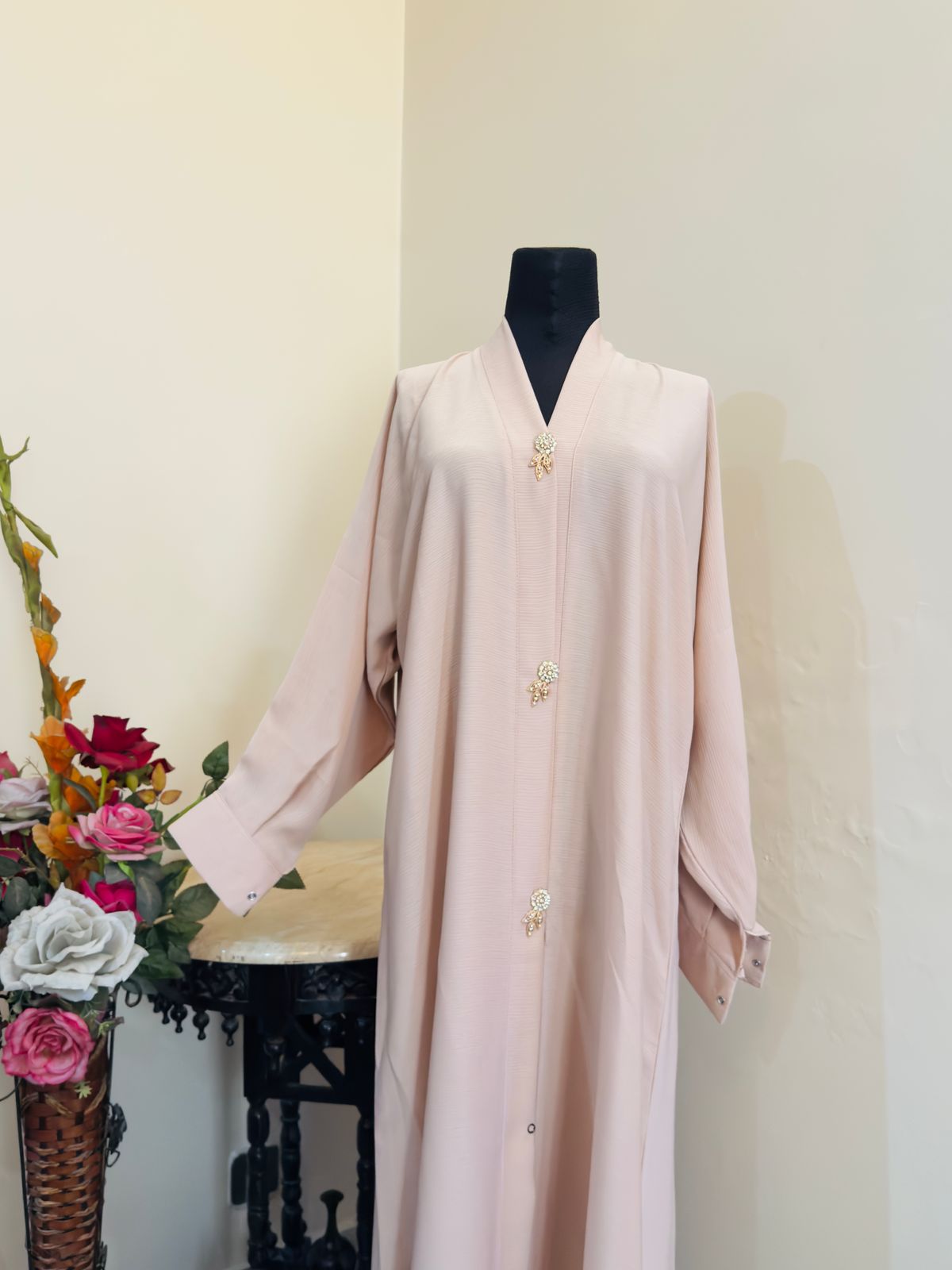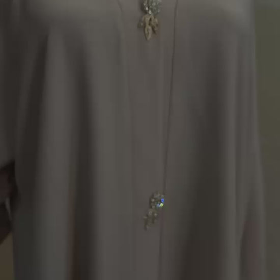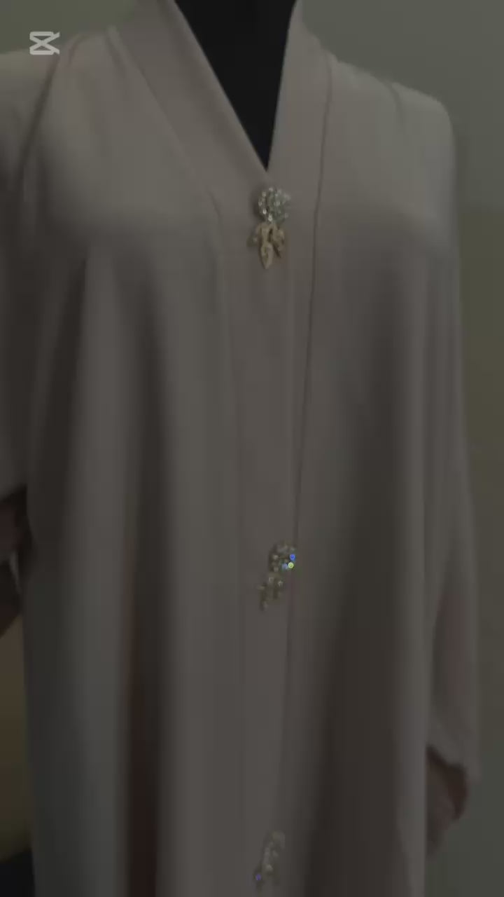 Effortlessly chic and oh-so-comfortable, this front-open crushed abaya is a must-have for your wardrobe. ✨ The intricate stone brooches at the front add a touch of elegance, while the flowy crushed fabric creates a flattering silhouette. Paired with the matching hijab, this abaya is perfect for any occasion, from casual outings to special events.