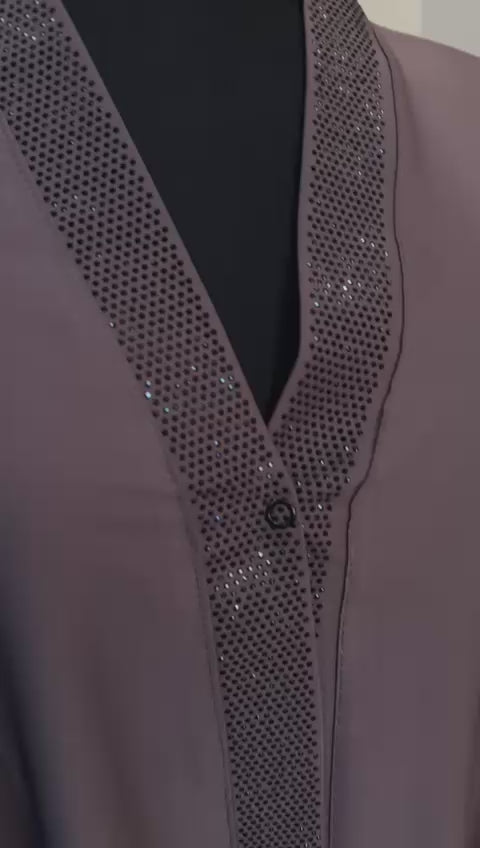Elevate your elegance with this stunning button-down front open abaya, adorned with exquisite stone detailing on the front patti and sleeves. Complete the look with the embellished belt for a touch of glamour. Crafted from luxurious nidah fabric for ultimate comfort and style. Perfect for any occasion