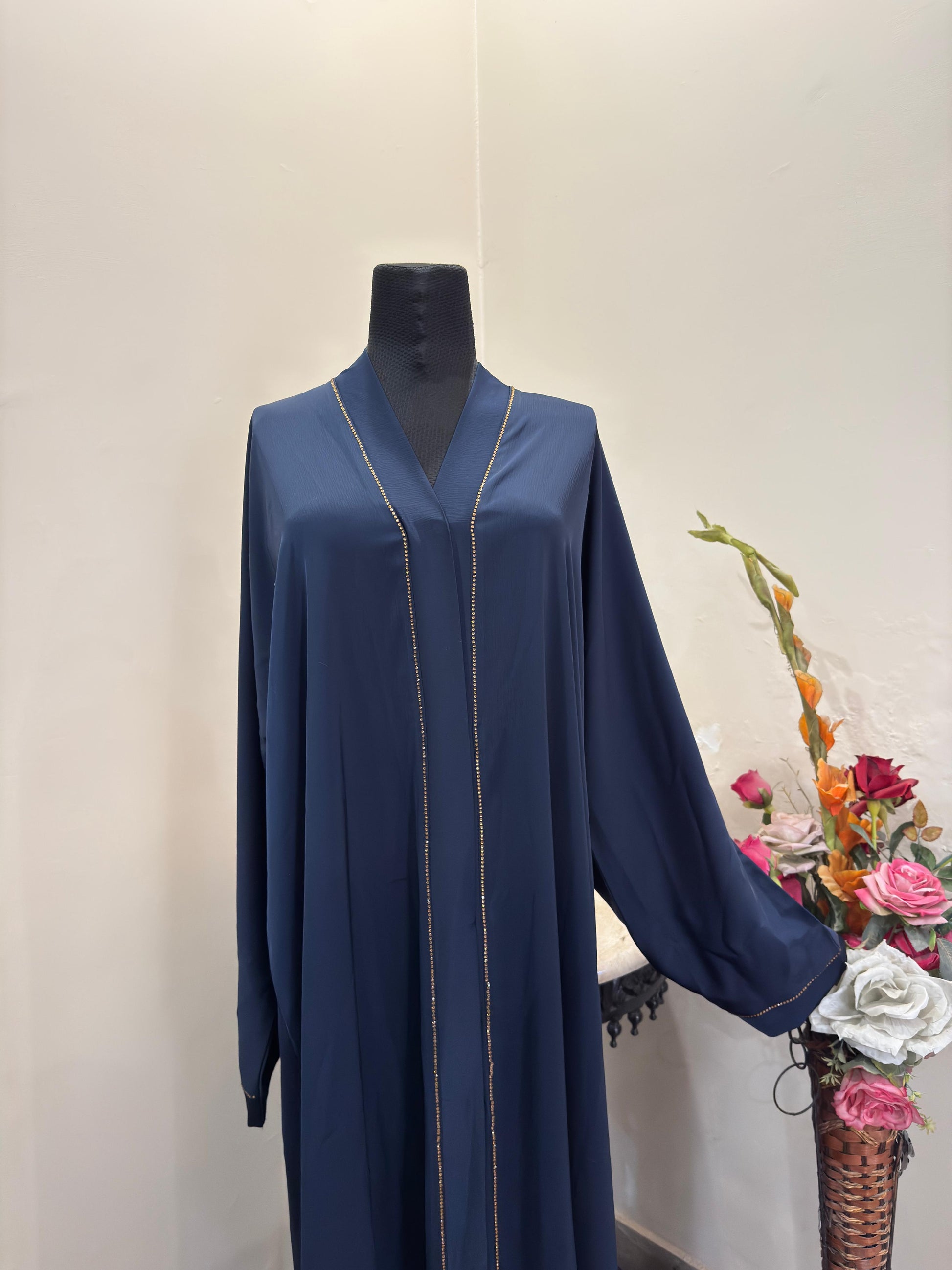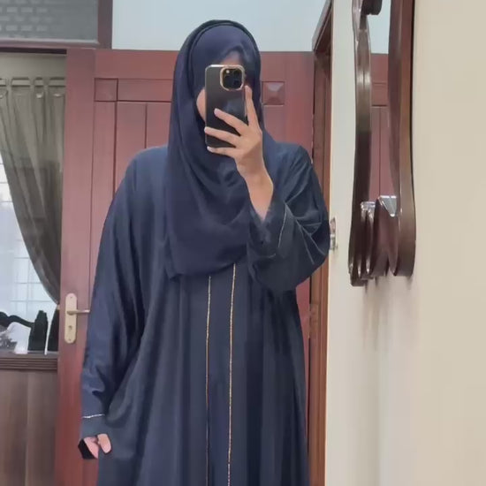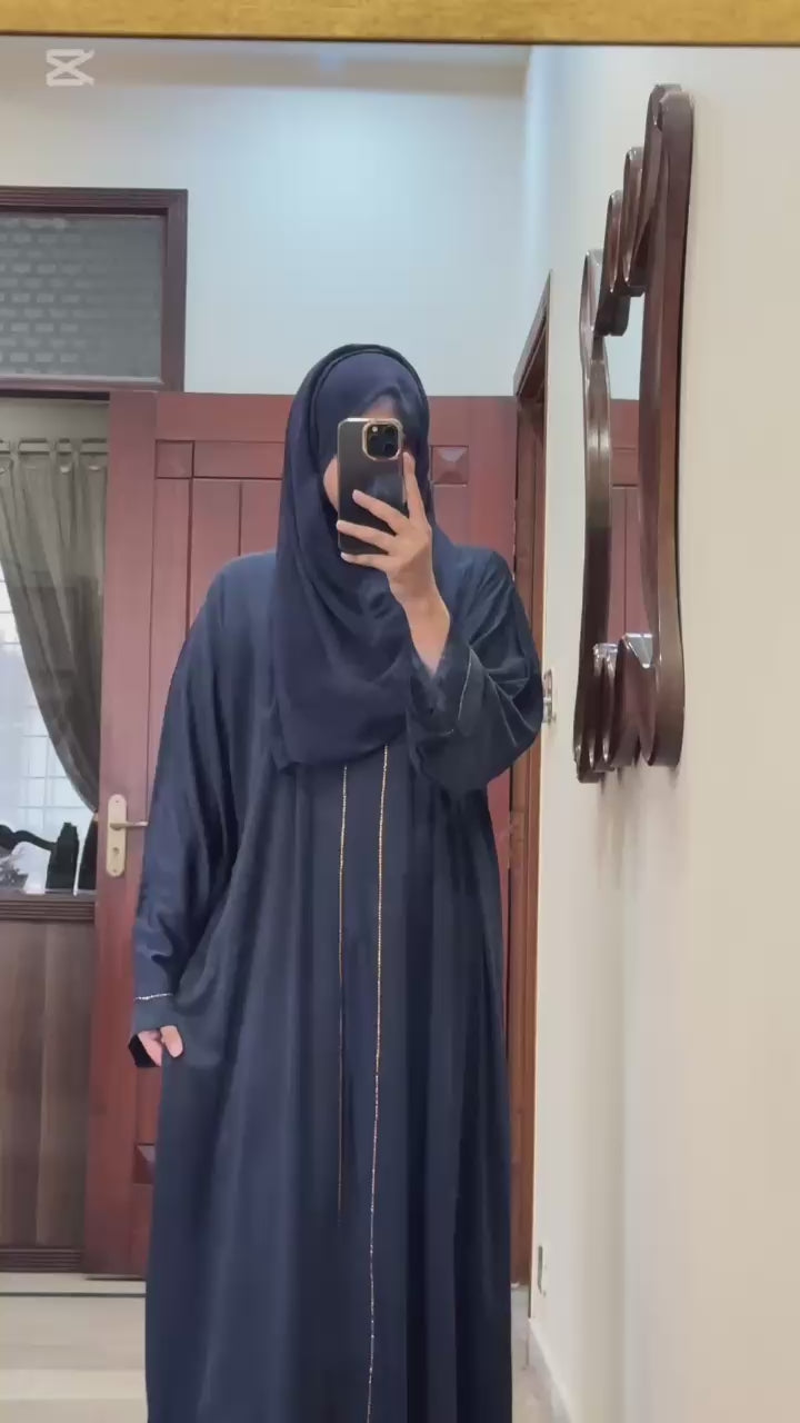 Stay cool and chic this summer with this stunning front-open silk crush nidah abaya! ☀✨  The breathable fabric is perfect for hot weather, and the matching hijab adds a touch of elegance.  The rhinestone embellishments at the front and sleeves give it a touch of sparkle, making it perfect for semi-formal occasions.  Get ready to turn heads with this elegant and stylish abaya!