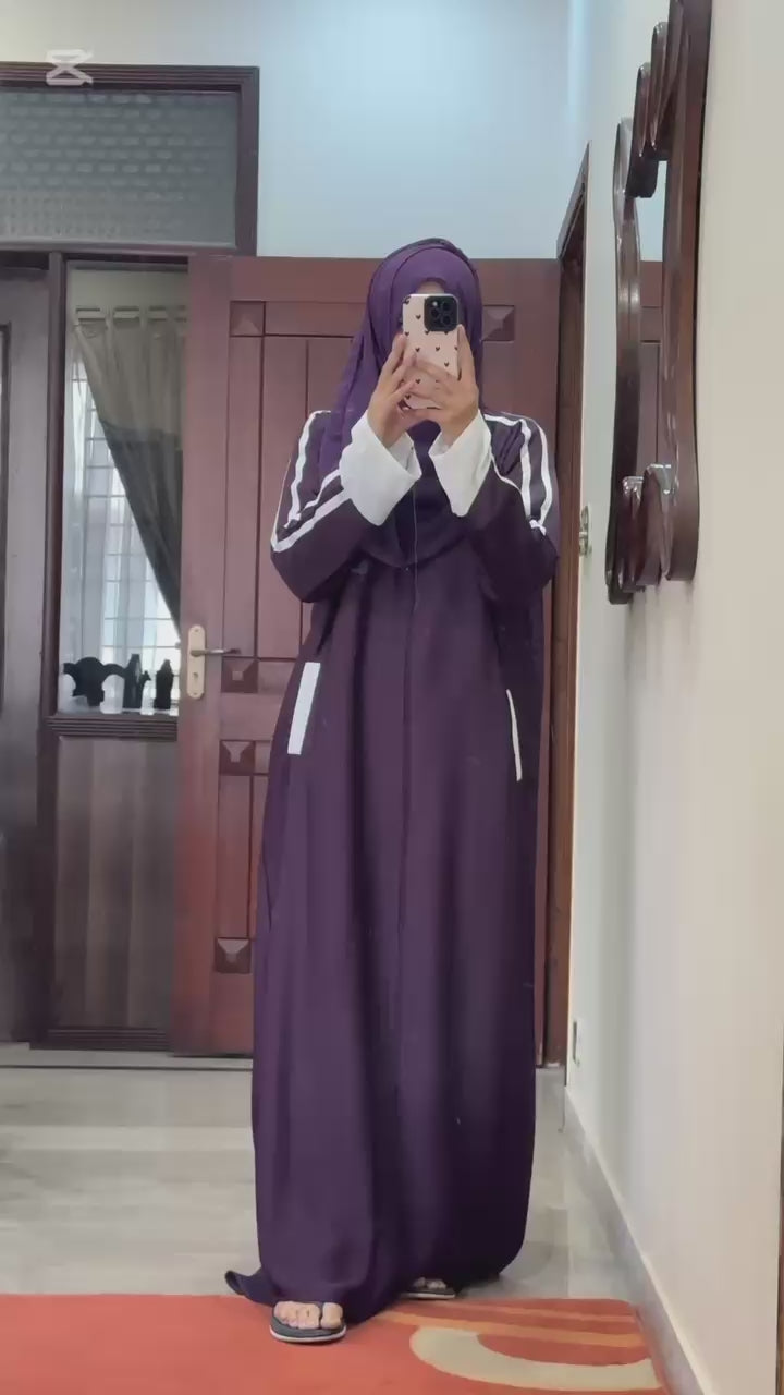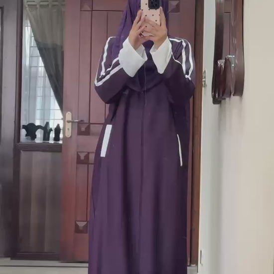 Ready to conquer your day in style! 💪 This sporty zipper hoodie abaya is both comfortable and chic. The white stripes on the sleeves and white detailing add a touch of modern flair. Crafted from soft nidah fabric, it's perfect for everyday wear. Comes with a matching scarf for a complete look.
