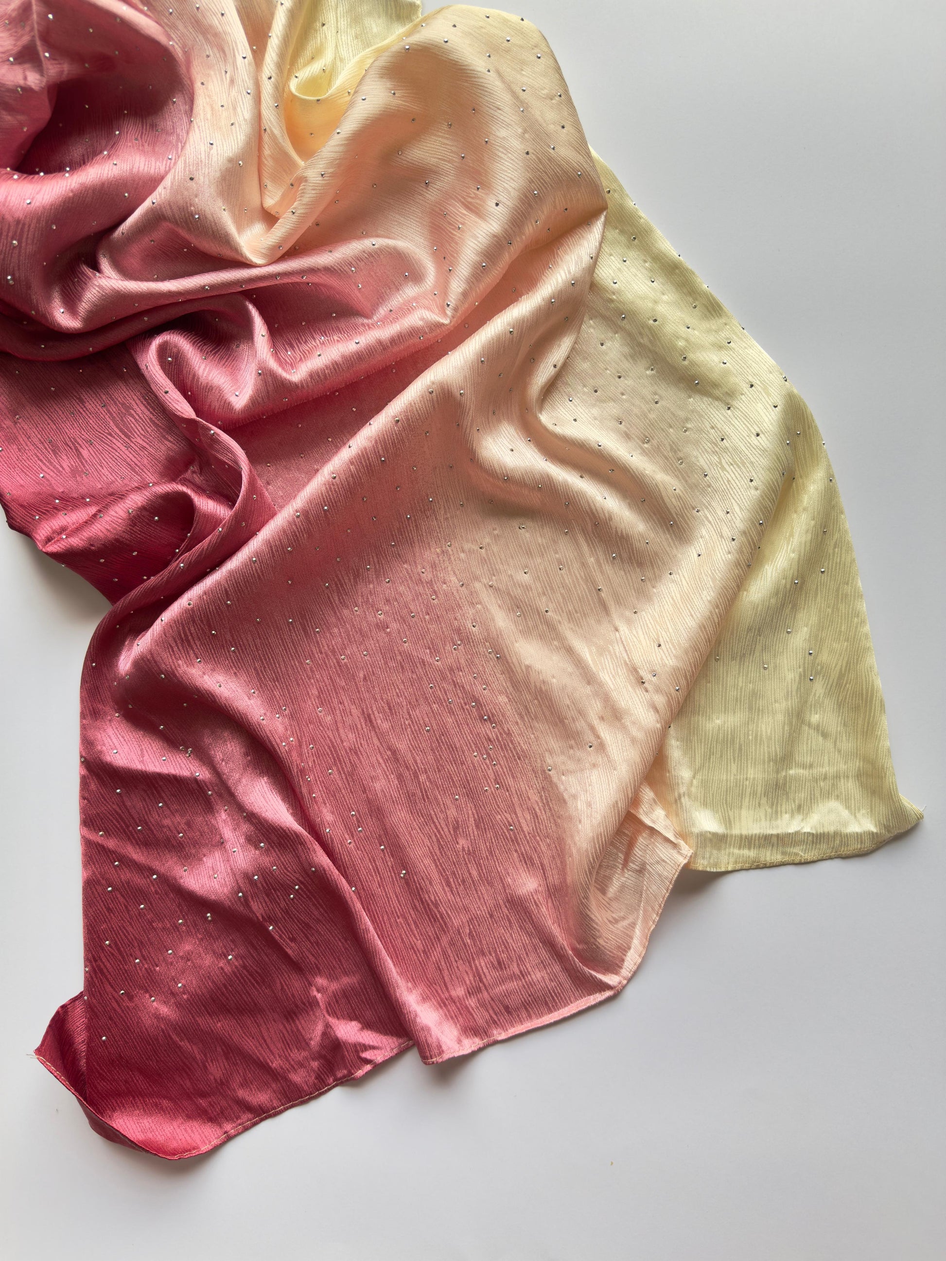 Elevate your style with our luxurious Ombre Silk Satin Hijab. This exquisite piece boasts a delicate self-print and is adorned with shimmering stones. With 18 breathtaking color options to choose from, you'll find the perfect match for any formal event